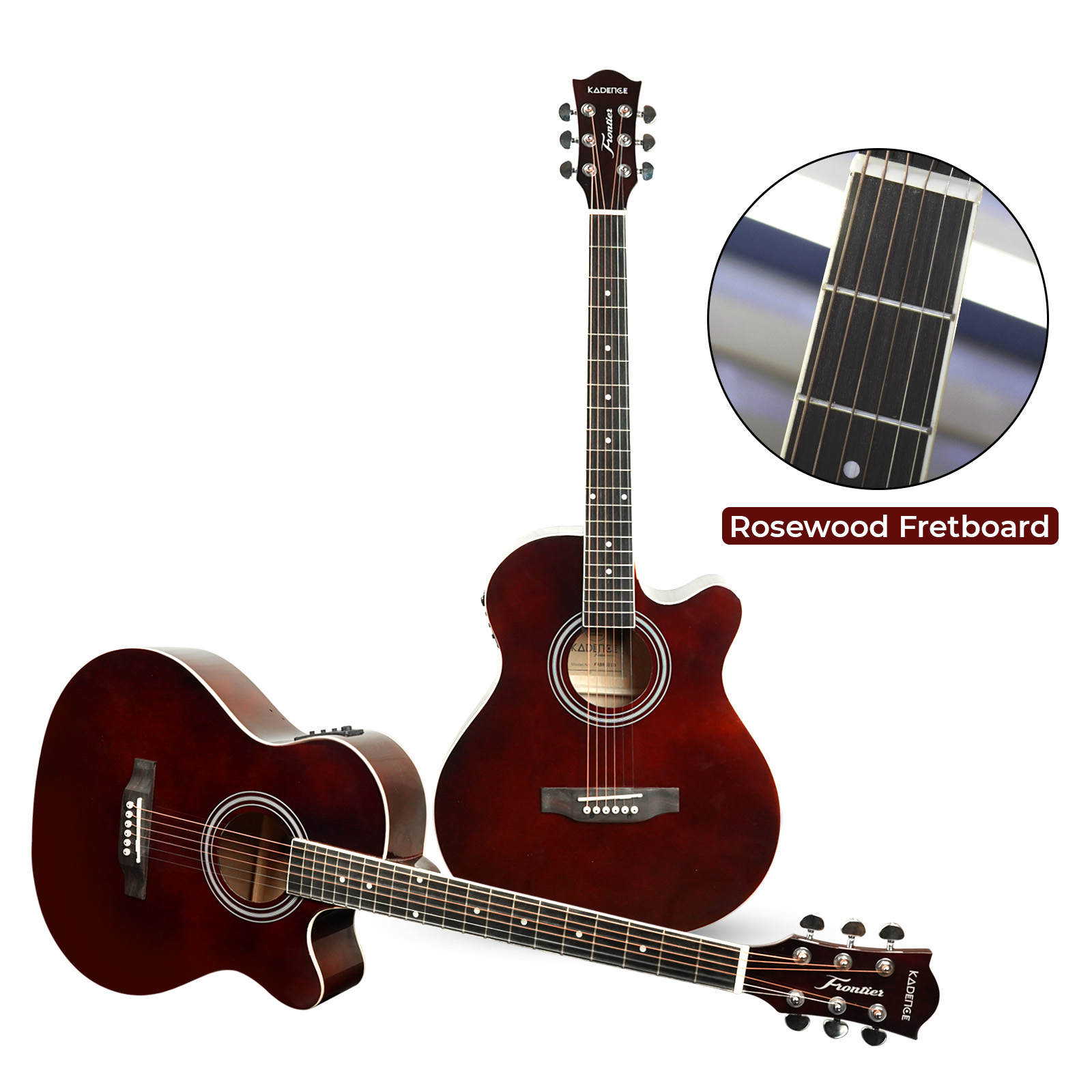 Built with beginner guitar players in mind at a budget friendly price with Linden Wood top, back & sides, the Frontier reflects aesthetic design with its glossy black finish, decorative inlays, rosewood fretboard makes it durable with its great sound carrying capabilities.