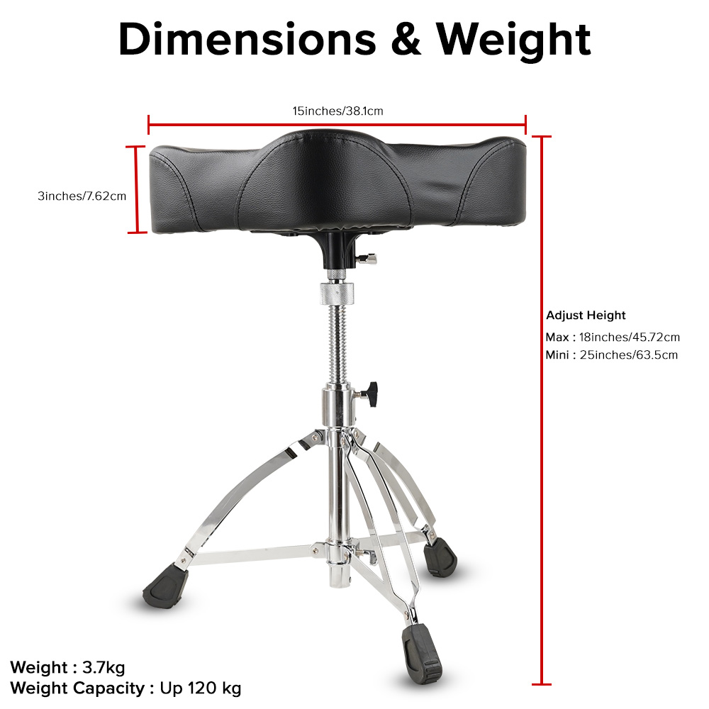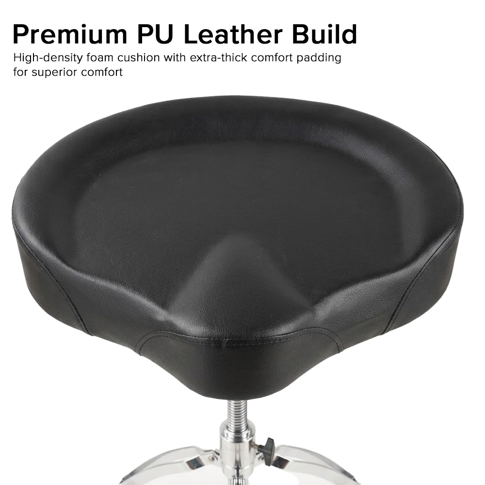 Premium Comfort Seat for Maximum Support & Fatigue-Free Playing – The contoured saddle seat is crafted from premium PU leather and features extra-thick high-density foam padding, providing excellent support and reducing fatigue during extended playing sessions. Its ergonomic design promotes better posture, allowing drummers to play longer with improved control and comfort.