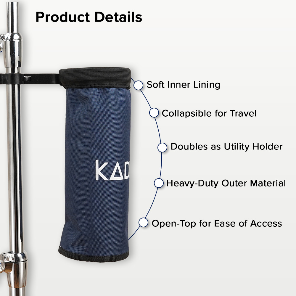 Keep your sticks, brushes, and mallets within easy reach with the Kadence Drumstick Bucket. Collapsible, lightweight, and built with durable heavy-duty polyester, it securely mounts on hi-hat and cymbal stands for instant access during practice or gigs. Perfect for drummers who want organized, reliable, and portable percussion storage.