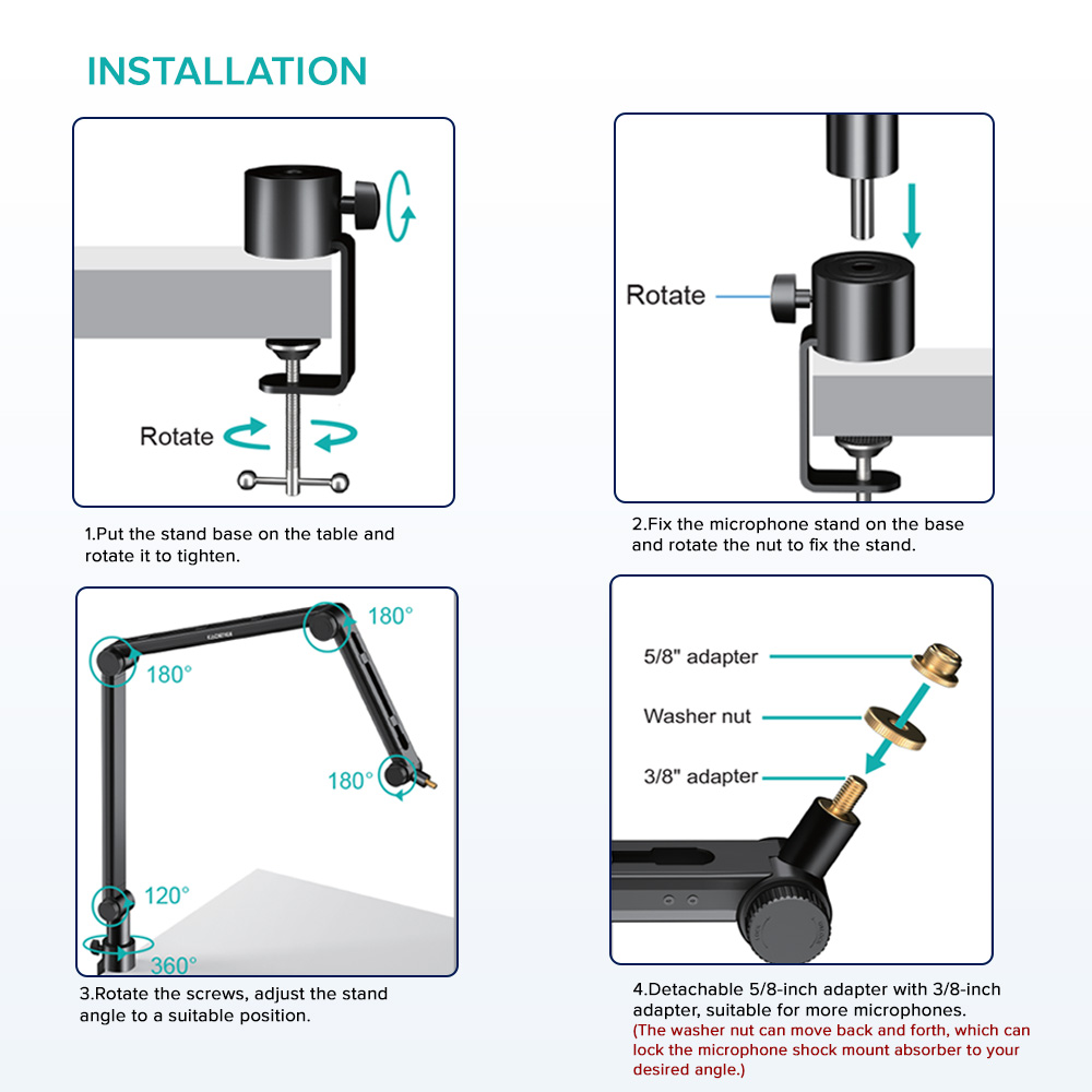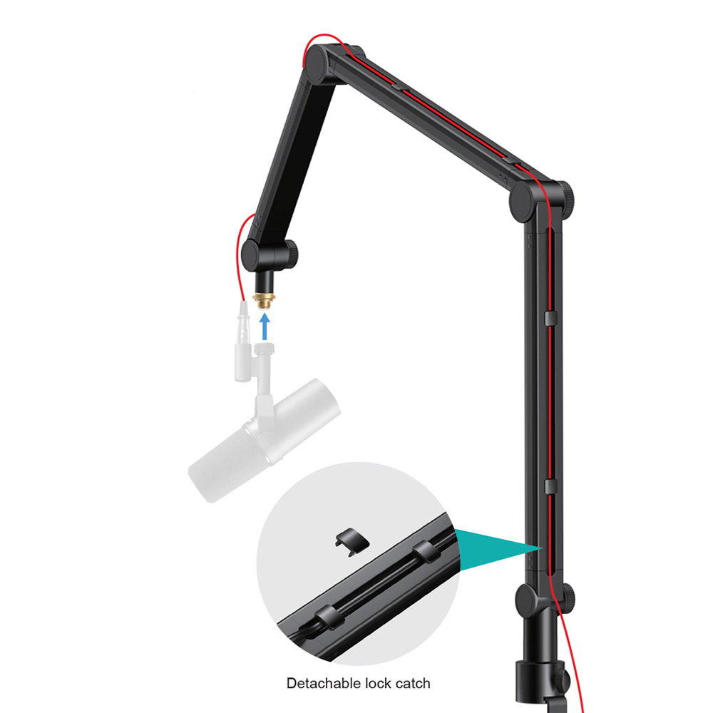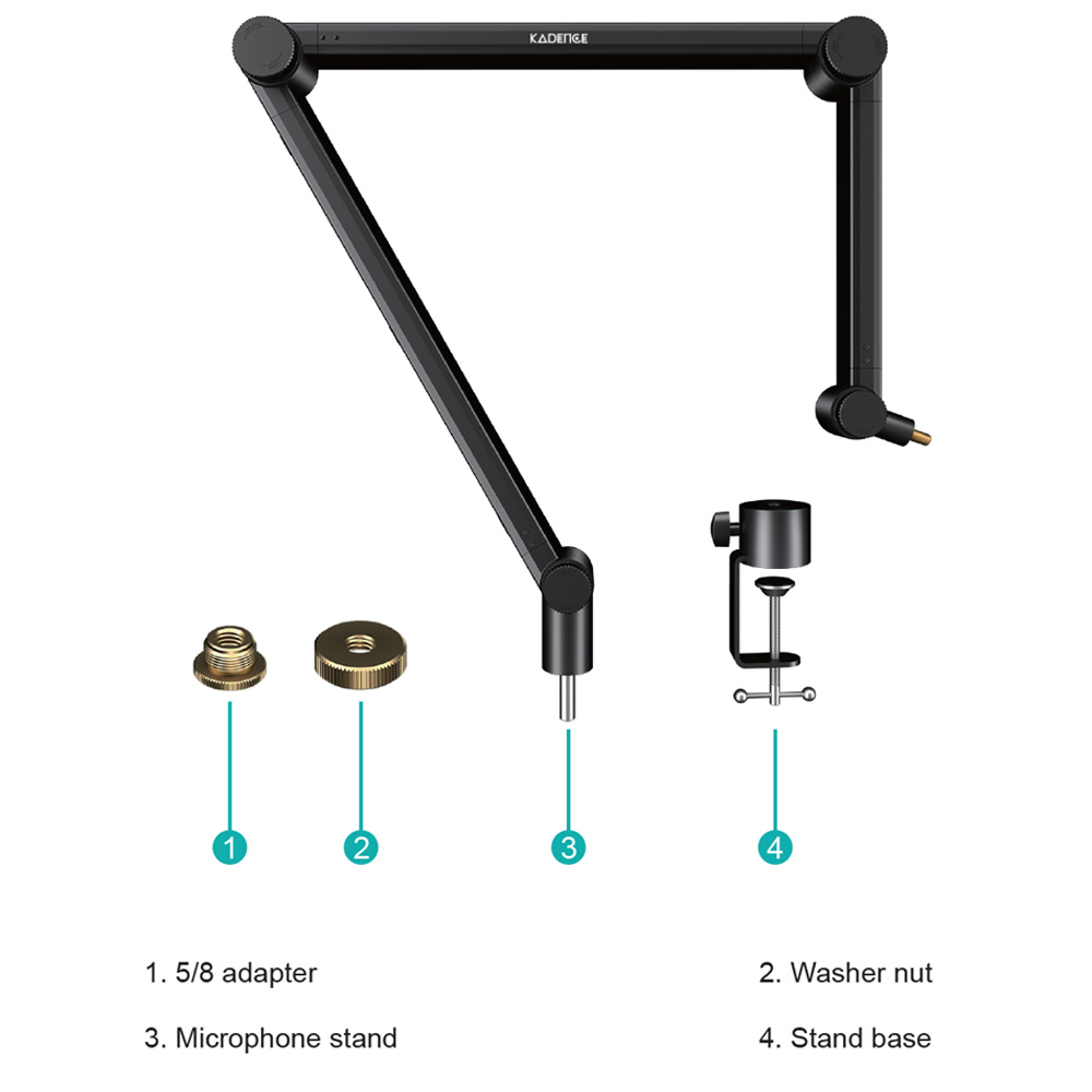 | Boom Arm Type | Internal Spring Articulating Boom Arm (Storage Design) | Included Accessories | 5/8″ Adapter, 3/8″ Adapter, Washer Nut, Stand Base, Detachable Lock Catches |