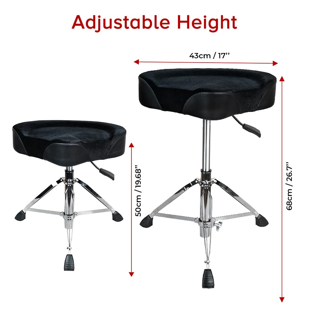 【ADJUSTABLE HEIGHT】: From 17.32 inches to 23.62 inches, this drummer’s stool swivels to meet the needs of specific adjustable heights instead of a fixed-height step.0.9-inch thick solid swivel rods represent durability and professionalism.