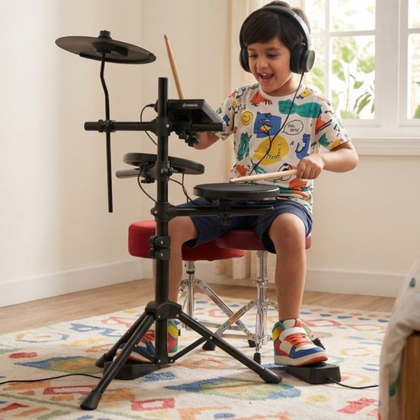 Built for beginners to intermediate drummers who need a responsive, feature-rich electronic drum kit for home practice, lessons, rehearsals, and small performances. With dual-trigger mesh pads, multiple preset kits, Bluetooth audio, and USB-MIDI connectivity, it supports skill growth while staying compact and home-friendly.
