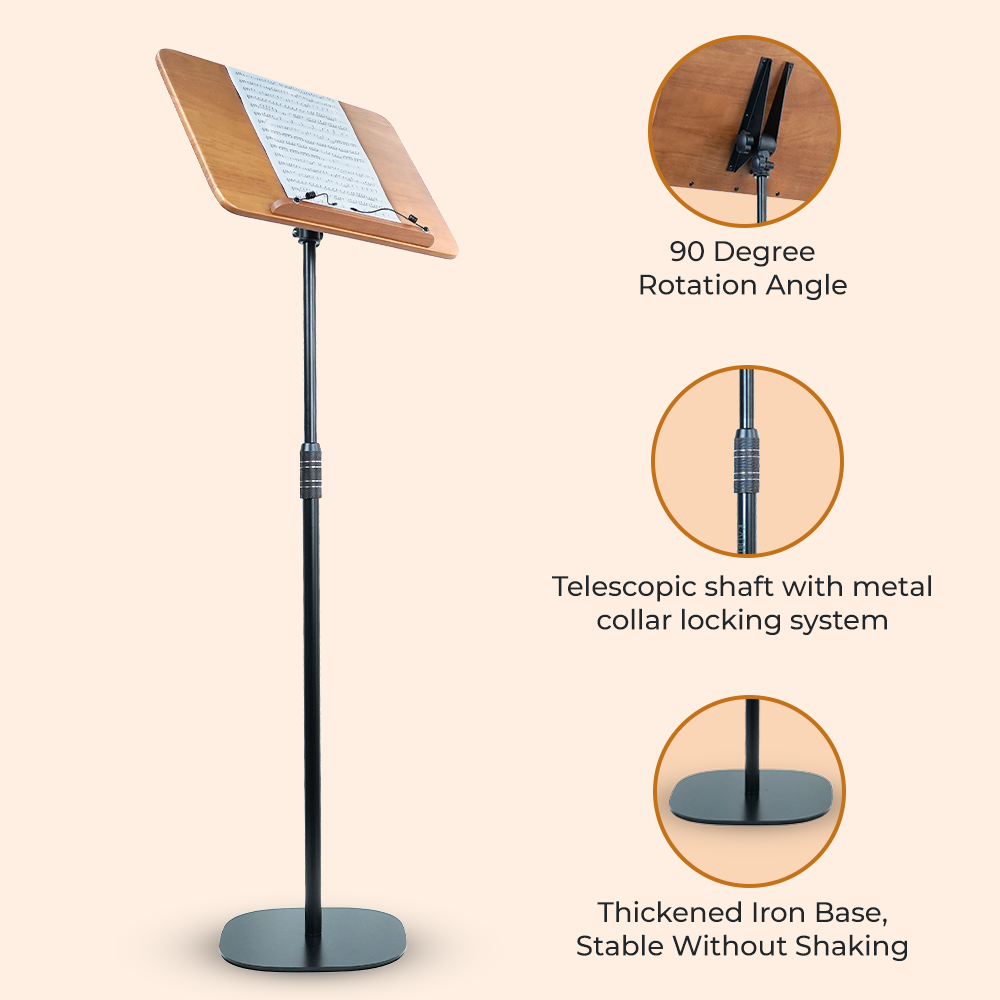Built for students, teachers, and performers who need a stable, height-adjustable floor music stand with a premium wooden finish and heavy anti-wobble base, ideal for studio, classroom, rehearsal, and stage use.