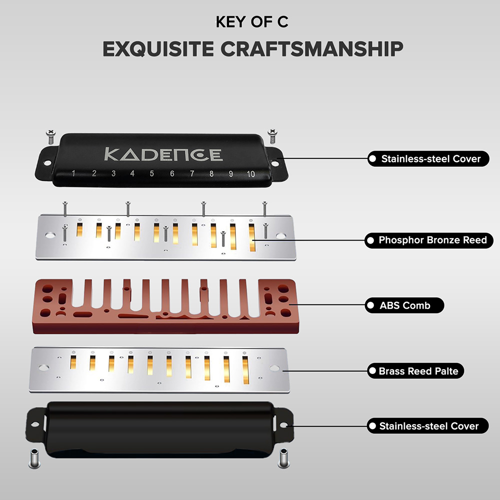 Kadence PB10 10-Hole Diatonic Harmonica | C Major | Brass Reed Plates | Stainless Steel Coverplates | ABS Comb | Includes Hard Case
