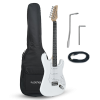 The box includes the Strat-style electric guitar, a padded gig bag, a 6.35mm instrument cable, a tremolo arm.