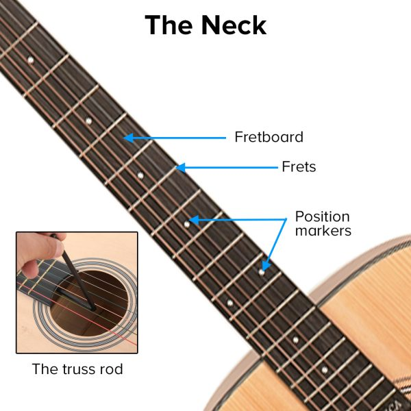 Here’s something most beginners don’t know: that metal rod inside your neck (the truss rod) is actually adjustable. It helps keep your neck straight and your strings playable – though it’s best to leave any adjustments to a professional until you know what you’re doing.